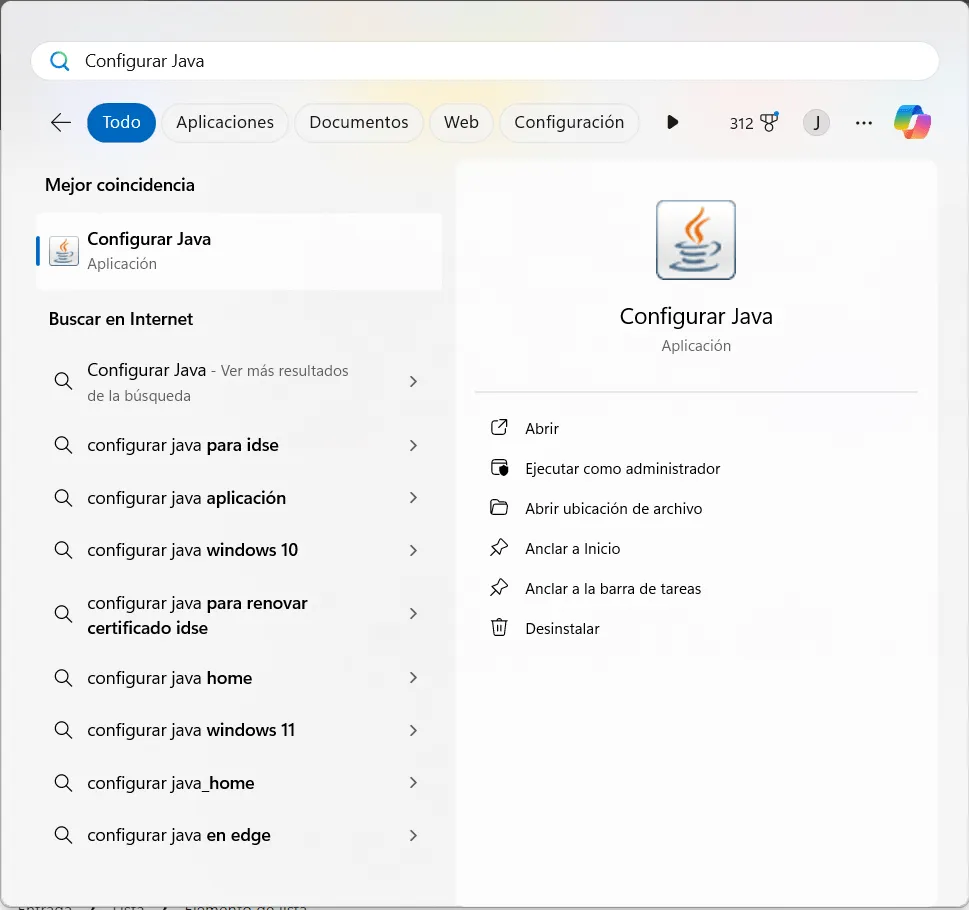 - Una vez reinstalado Java, busca en Windows “Configurar Java” y abrelo.