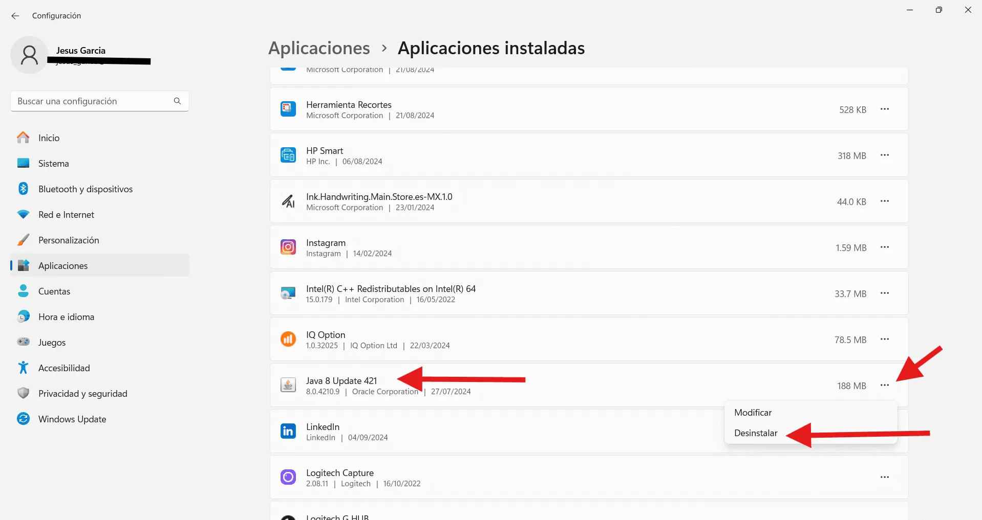 - Para ello, primero ve a Configuración de tu PC > Aplicaciones > Aplicaciones Instaladas. Busca Java y Desinstálalo.
