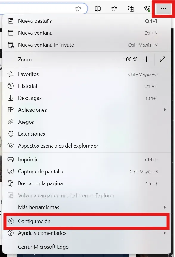 - Abre Microsoft Edge, ve a los tres puntos en la esquina superior derecha y de ahí en «Configuración«.